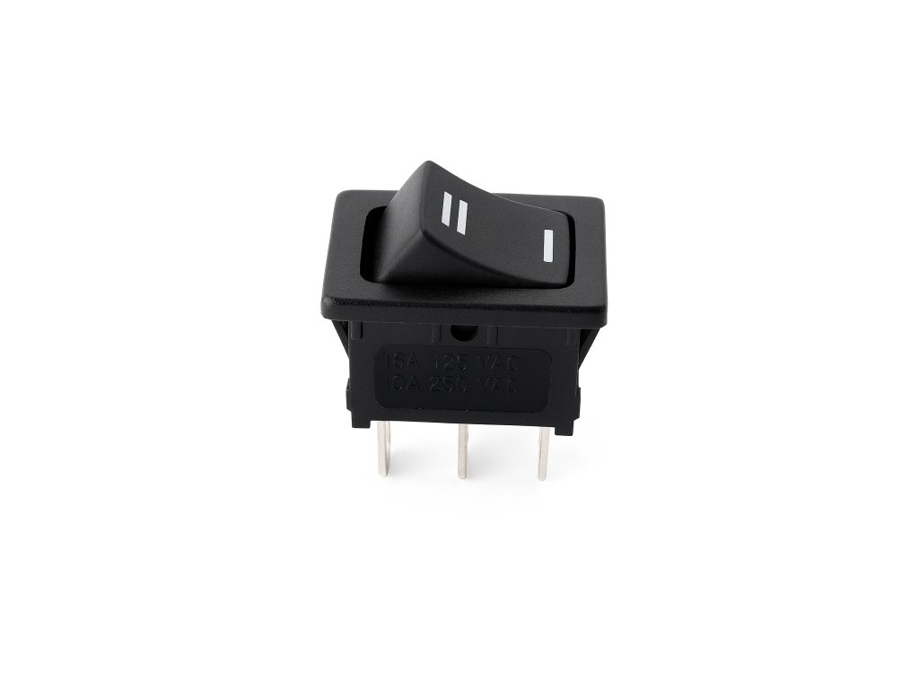 Jednopólový kolébkový (rocker) vypínač pro panelovou montáž, vhodný pro síťové i stejnosměrné aplikace. Černé provedení s aretací v poloze ON/OFF, robustní plastové tělo odolné vůči mechanickému namáhání a zvýšené teplotě. Ideální pro přístrojové panely, spotřebiče a průmyslová zařízení.