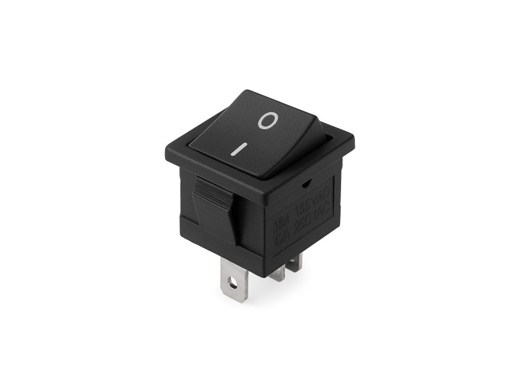 Dvoupolohový kolébkový vypínač pro panelovou montáž v černém provedení. Robustní plastové tělo a spolehlivý kontakt zajišťují dlouhou životnost i při vyšších spínacích proudech. Vhodný pro spotřební elektroniku, přístrojové panely, průmyslové ovládací boxy i domácí spotřebiče.